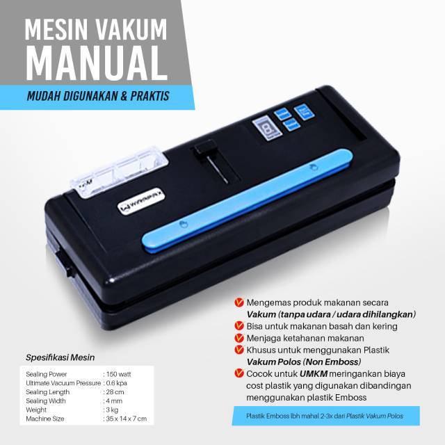 Harga sebanding dengan kualitas yang ditawarkan. Teknologi pengemasan makanan dengan mesin vakum menjadi alternatif terbaik untuk mengurangi penggunaan bahan pengawet. Mesin penutup segel kantung makanan snack mini portabel dengan model penekan. Cara kerja mesin vakum adalah dengan menyedot semua udara dari dalam kemasan sebelum disegel.