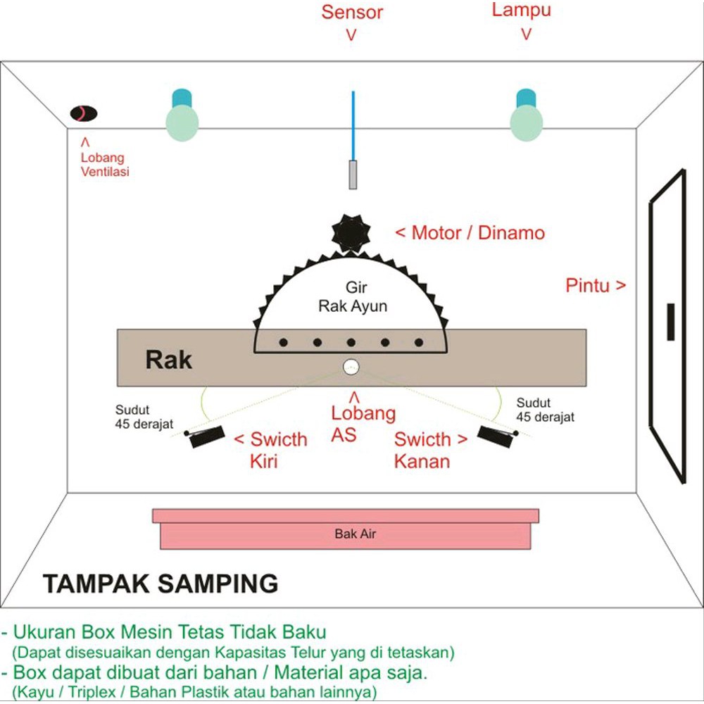Buat lubang dengan ukuran 10 x 5 cm pada bagian atas kotak mesin tetas untuk ventilasi udara dan berilah penutup yang dapat dibuka dan ditutup seperti gambar 1. Membuat mesin penetas telur merupakan jalan penting bagi pengusaha ternak unggas. Pada dasarnya setiap telur membutuhkan 4 hal yang harus diatur dengan hati hati agar embrio dapat tumbuh berkembang dan. Namun bagi pemula usaha yang memiliki dana terbatas untuk membeli mesin penetas yang harganya tidak bisa dibilang murah ini bisa membuat alternatif dengan cara membuat mesin penetas telur sendiri.